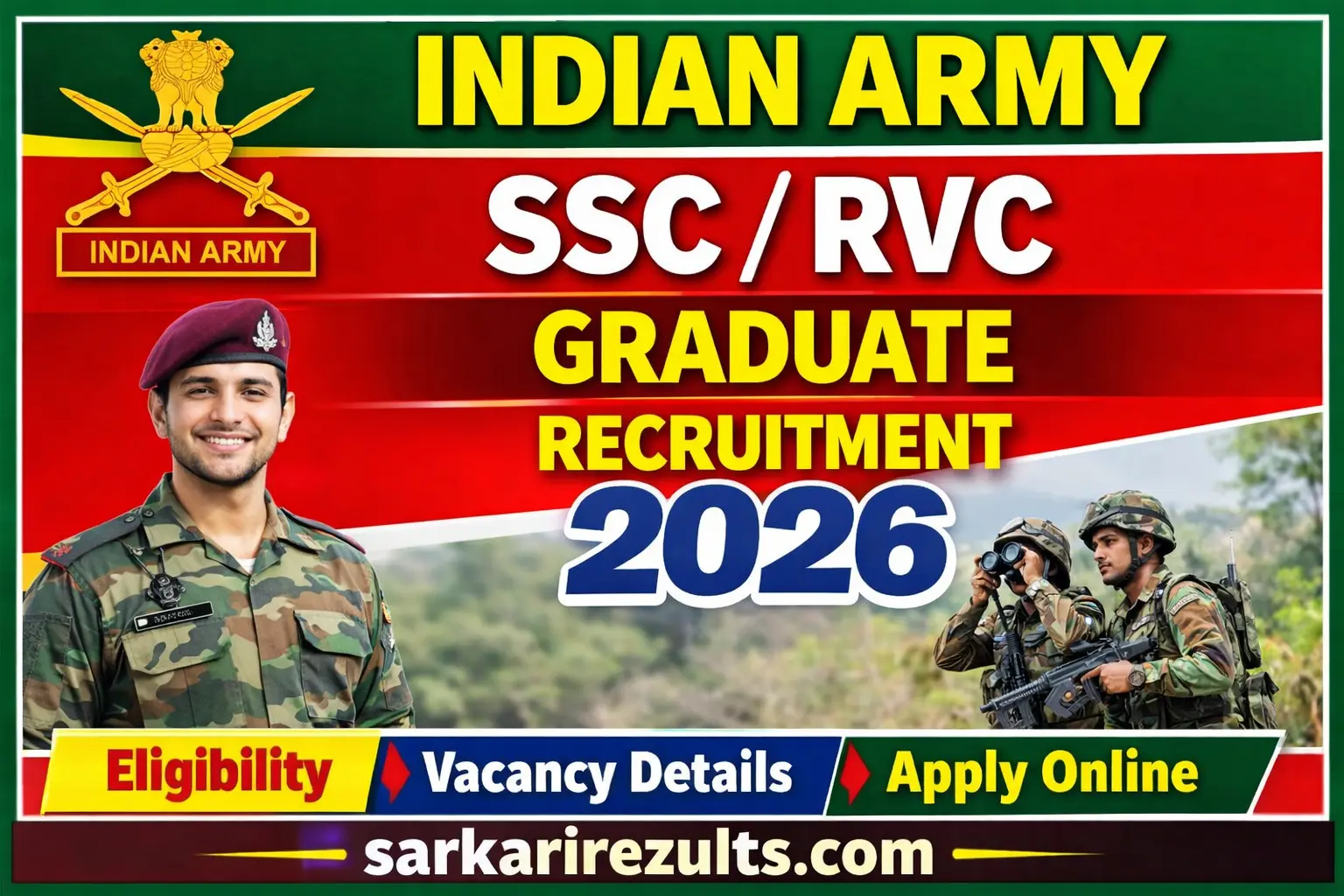 The Indian Army has published a short notification inviting applications from qualified male and female veterinary graduates for the grant of Short Service Commission (SSC) in the Remount and Veterinary Corps (RVC). This recruitment pertains to the 95th SSC (RVC) Course. Eligible candidates holding a recognised degree in Veterinary Science & Animal Husbandry (BVSc / BVSc & AH) may apply online through the official Indian Army recruitment portal. The application window for women candidates opened on 15 April 2026, while applications for men opened on 17 April 2026.